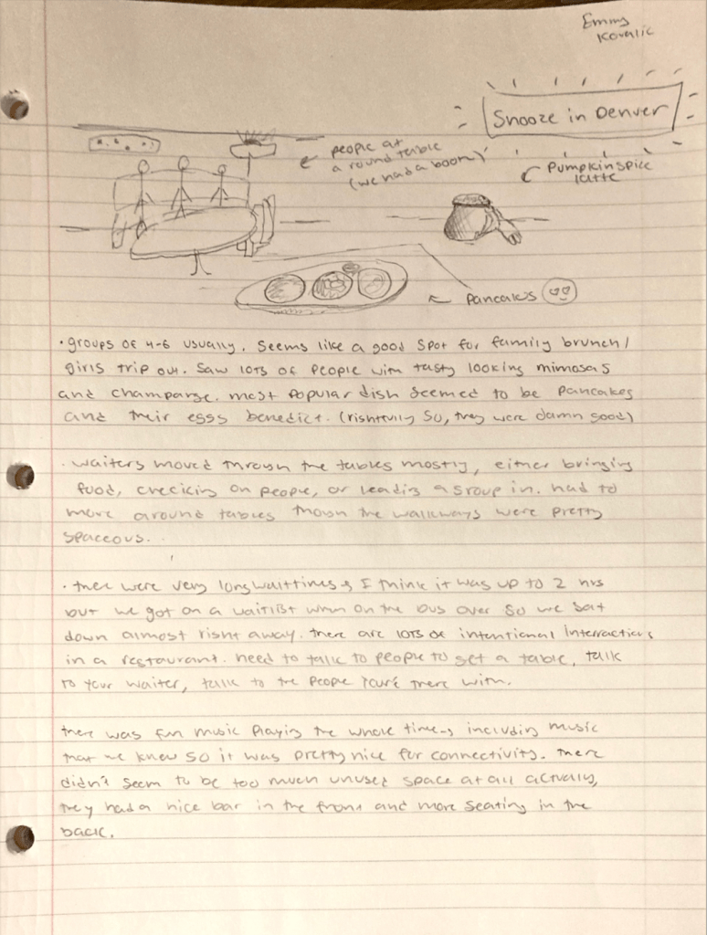 For this observation, we had to go out somewhere in public to see how people interacted with the environment and other people in that space. I was in Denver for a bit, so I decided to sit down at a brunch place called Snooze. While having brunch, I noticed the groups of people having brunch seemed to be girls trips or families. The wait times were really long but there was a way to skip the wait with an app called wait time.