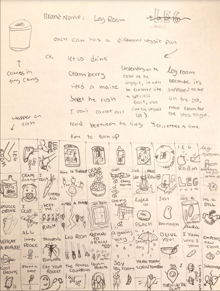 For this project, we had to come up with a fictional meal replacement drink. I chose to make one called “leg room” as sort of a pun on having enough room to be on the go all the time. I also thought it would be funny if each can had a food pun on it because the drink is supposed to “replace” those foods. Out of the three final designs I came up with, two of them have to do with music which I thought was funny because I mainly chose them because I liked their designs the best and thought the names were good.