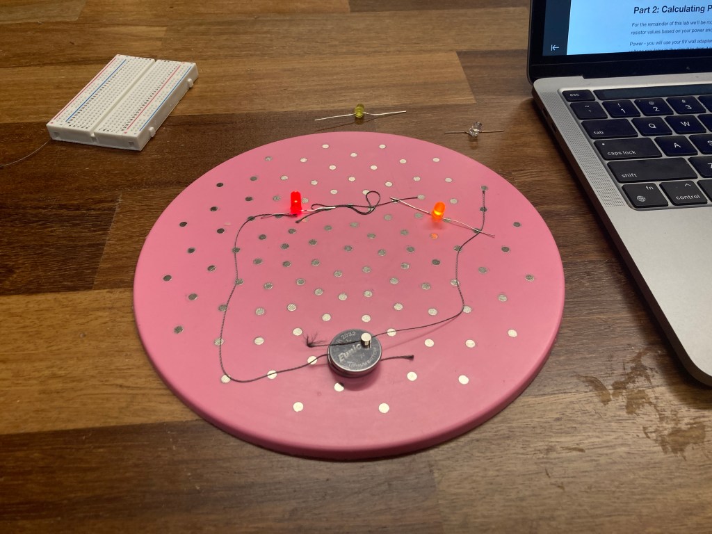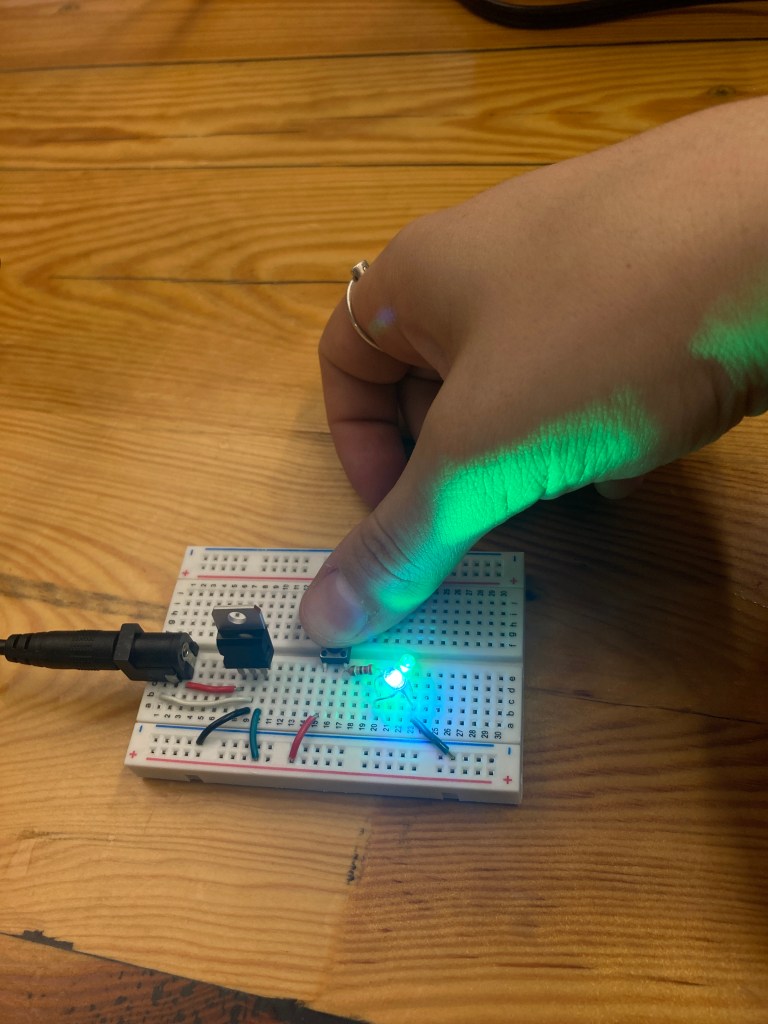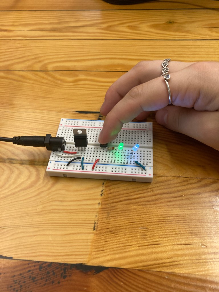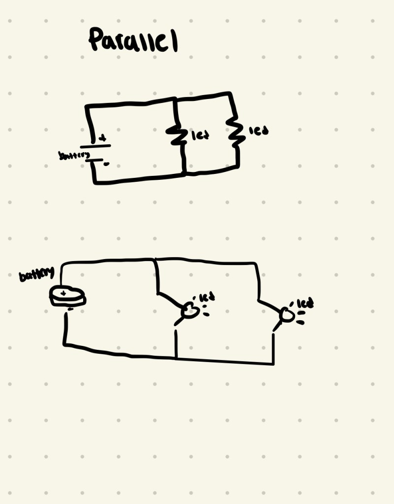 Looking at the difference between the LED’s in series and parallel, I could tell that they were brighter when they were arranged in parallel. This is because they aren’t sharing the voltage, but rather they both get the maximum amount of voltage which makes it brighter. When trying out different LED colors, I noticed that red tended to be less bright, and colors going towards white were brighter (aka, blue, green). In series, when I added 2 LED’s I could tell that they were both dimmer than when I only had one, but in parallel adding another LED didn’t change the brightness.
