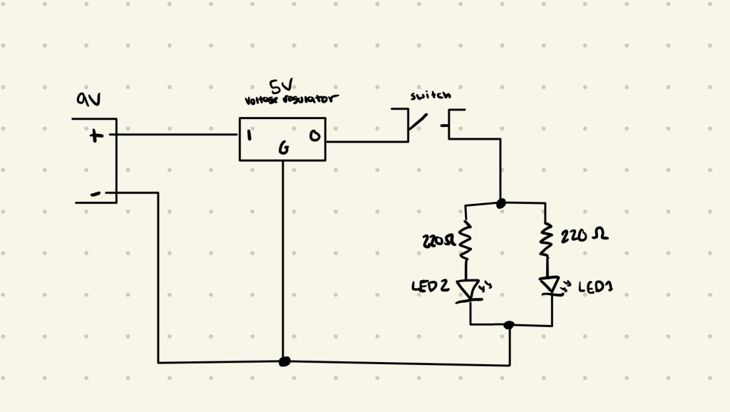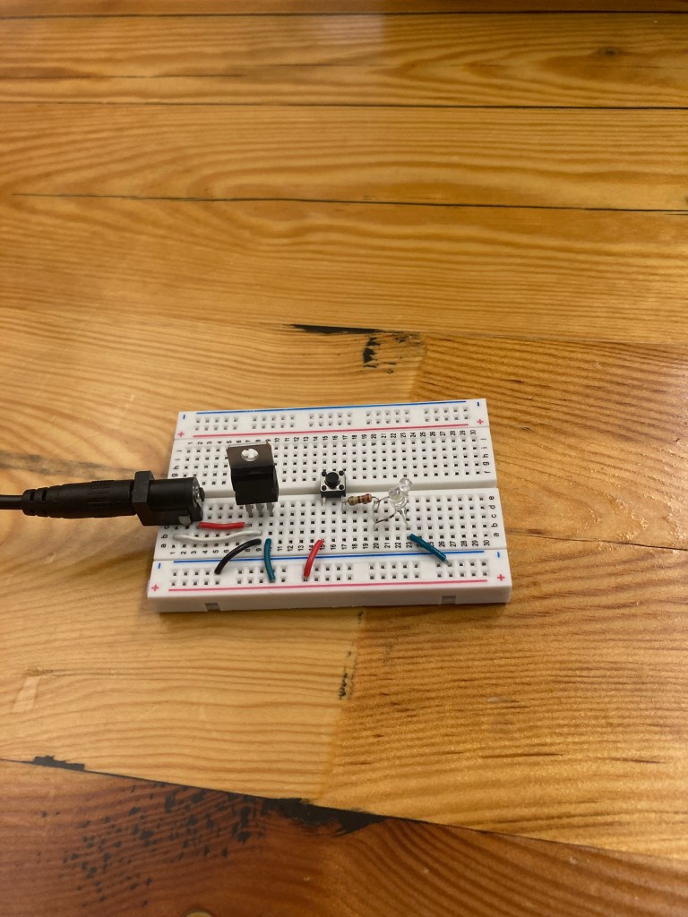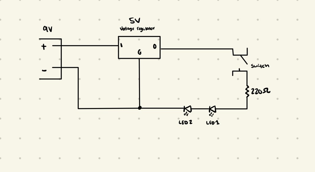 To find the resistor that we need, we can use Ohm’s law to calculate the resistance we need knowing the voltage and the current that runs through the LED’s. I used a voltage regulator to drop the input to 5V, and I looked up the current through blue LED’s, which was ~20mA. Using the equation, I got a resistor value of ~250Ω. The closest resistor value was 220Ω, so I used that one.