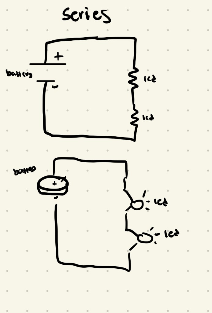 For the circuit in series, I hooked the LED’s up one right after another, then linked the second one back to ground. For the circuit in parallel, I put both of the LED’s so they attached to the switch, and then they were both attached to the ground wire.