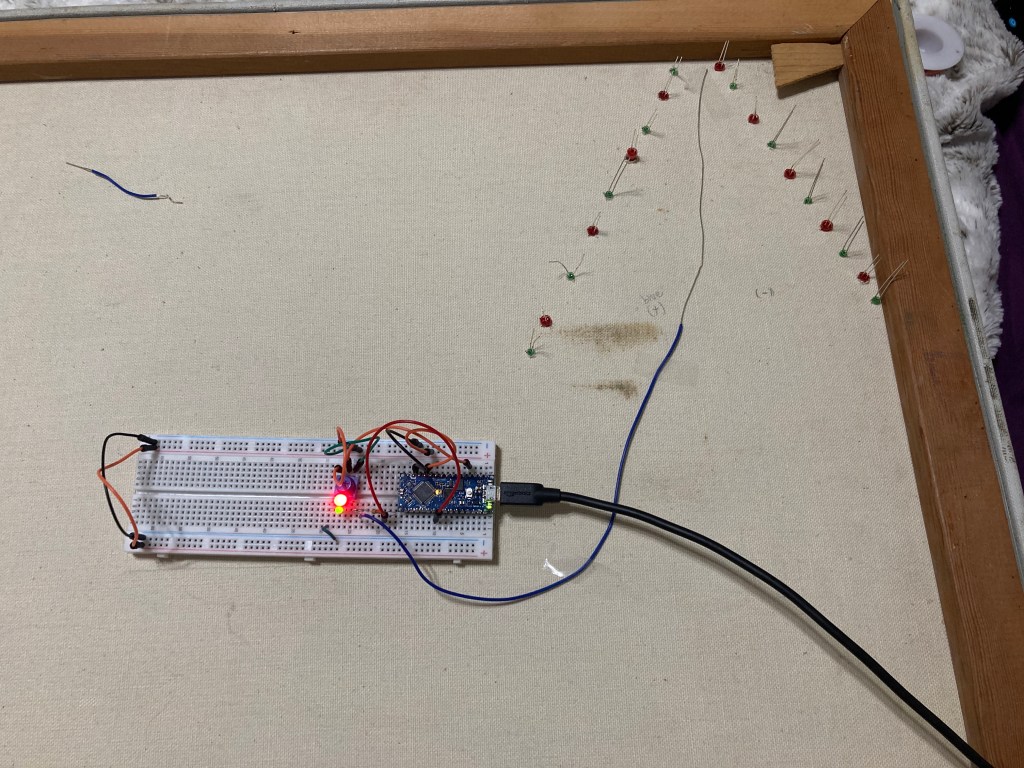 After getting these done and all working, I added a potentiometer input that made the LED’s turn on and off. This I attached to the top of the painting. I then wanted to add a light in the window, so I added another LED into the painting, then hooked that up to a push button that turns it on when the button is pressed down. Attached to the same button was a speaker that I programmed to play christmas music with the tone() function.