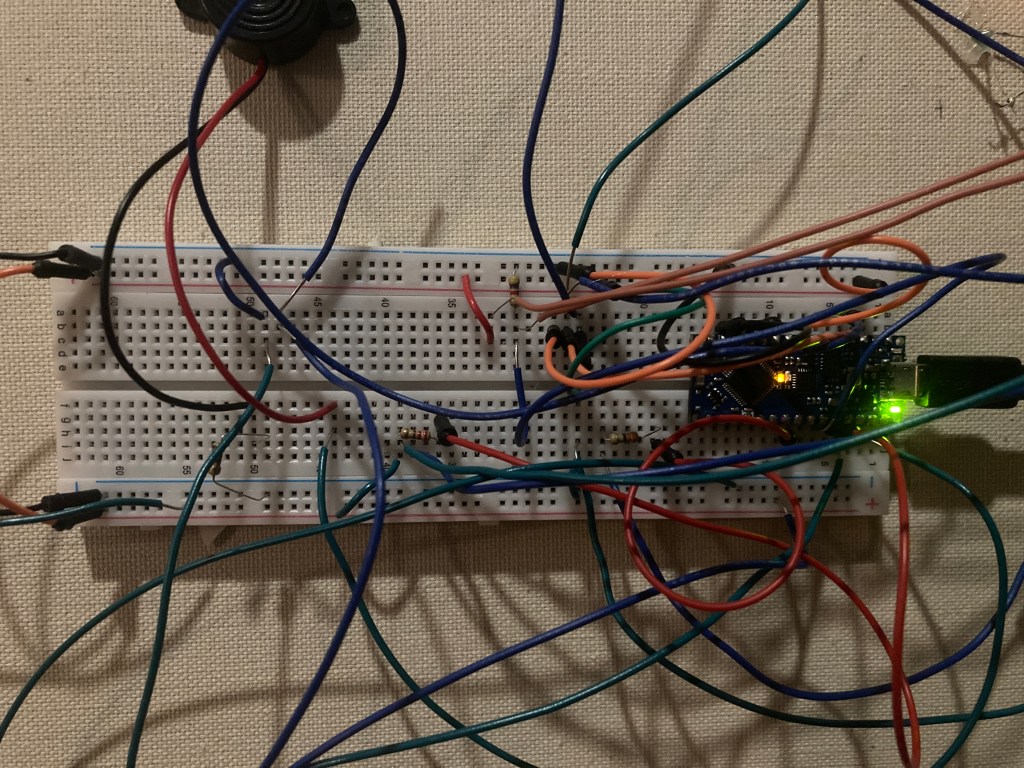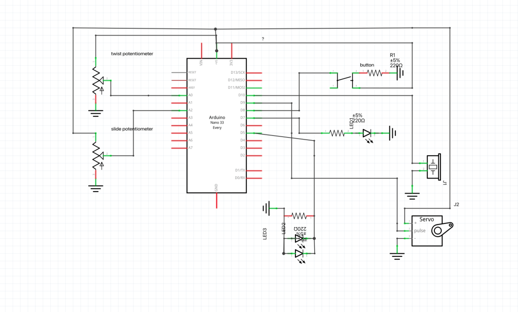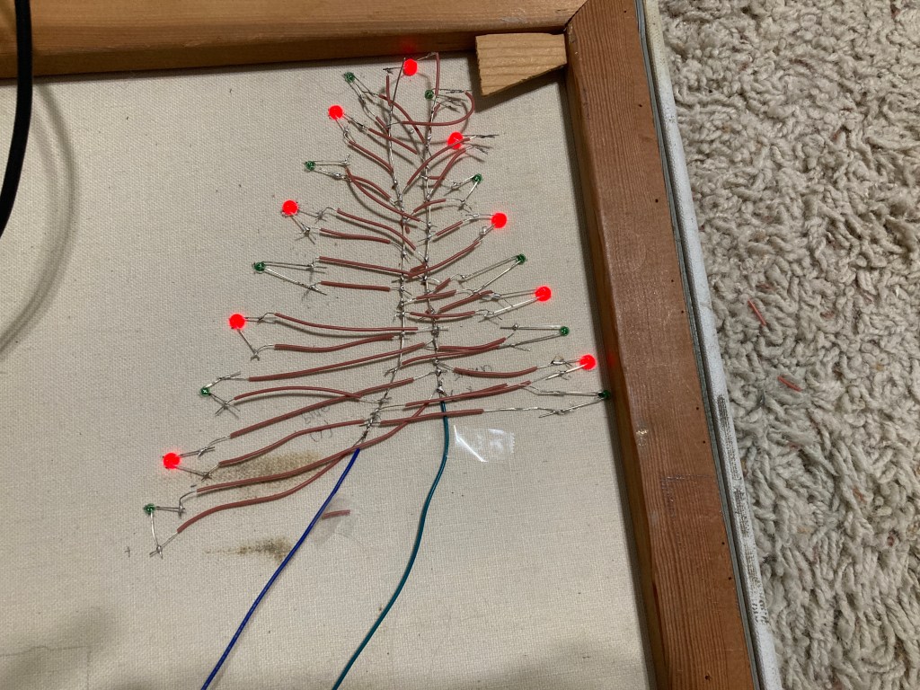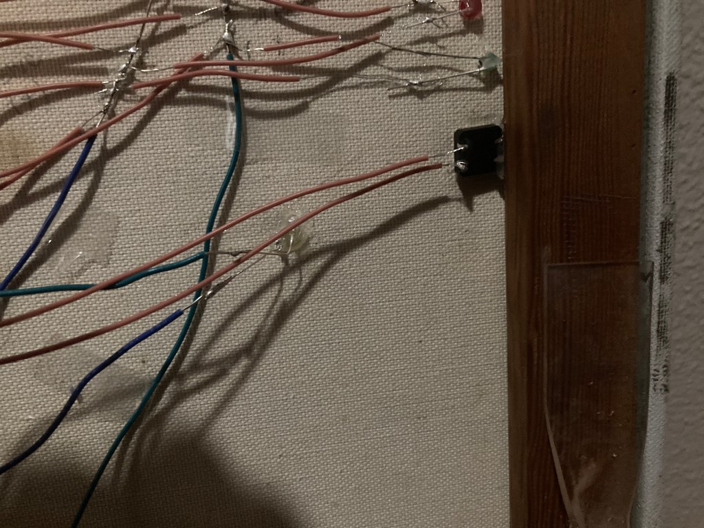 The painting has a lot of random parts built onto it, and I would always think “what if they actually did something?” So I decided to create an interactive painting of my own. I was also inspired by all the interactive galleries I have been to lately, where you can interact with art (Meow wolf, mainly, that place is so cool and trippy). I decided to thrift a painting and build onto that. In the end, I ended up with 3 different inputs and 3 different outputs. If I had more time, I would love to build off of what got done. Before I thrifted the painting, I wasn’t completely sure what I wanted to do but I did a lot of research on different interactive paintings that people have done, and as soon as I got the painting I applied some of the things that I found. For a lot of the connections, I poked holes through the actual painting and stuck the LED’s through, or a button/potentiometer through. Because it is around the holidays, I included some “christmas lights” and my speaker plays a christmas song. I know that I wanted to do LED’s for the lights, but I had the challenge of trying to figure out how to attach a lot of them to my circuit because I knew I couldn’t put them in series otherwise none of them would be getting power, so I found a way to connect them all in parallel (lots of solder).