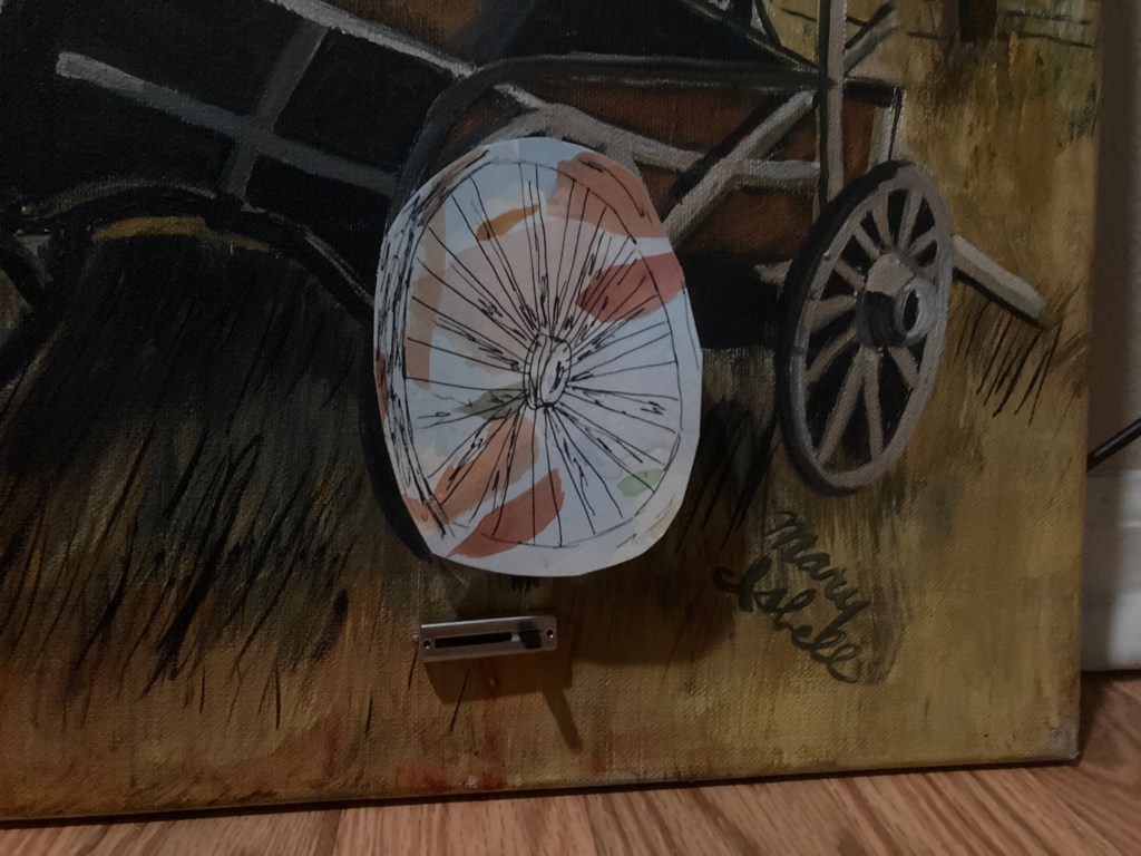 Over in the other corner of the painting, I added a servo and controlled it with a slide potentiometer, and added a paper wheel on top so it looked like the wheel was spinning when you would give it input.