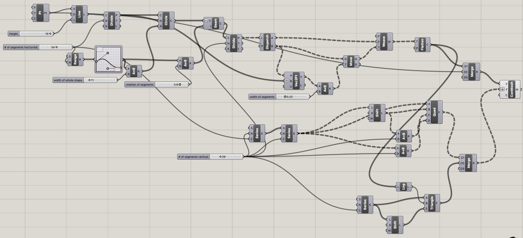 I followed the youtube tutorial to create basic parametric vases, and had 7 tunable parameters. Those were 1) the height of the vase, 2) the number of vertical segments, if you make this number higher it will look smoother because there will be more sides, 3) the number of horizontal segments, if you make this number higher it will also make it look smoother, 4) the width of the shape, 5) the width of the individual segments, will make the top of the vase opening smaller or larger, 6) the rotation of the segments, makes it more or less circular/star-like, 7) a graph that adjusted the vase shape, which includes the width of certain sections, the size of the opening and base, and where the biggest part of the vase was positioned.