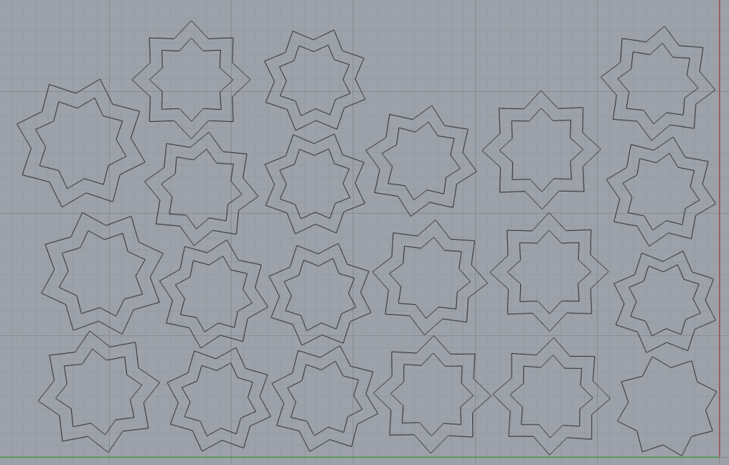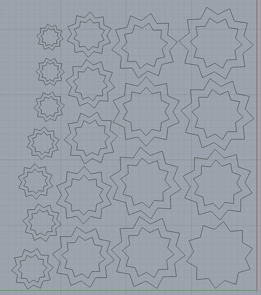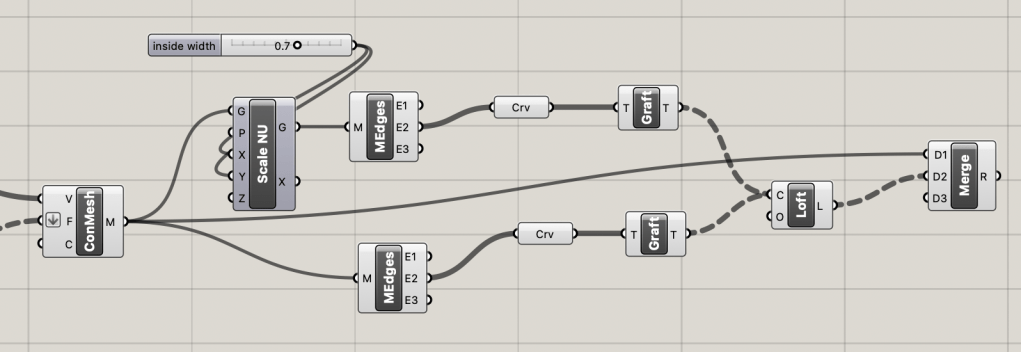 I originally had the vases with no internal thickness, but since I want to laser cut these vases I updated my grasshopper code to include a tunable parameter to make the hole of the vase bigger or smaller. I got the edge of the inside part of the vase and the edge of the outside of the vase and bridged them together, then exported that bridge and the original output together. Here is that grasshopper code