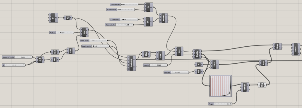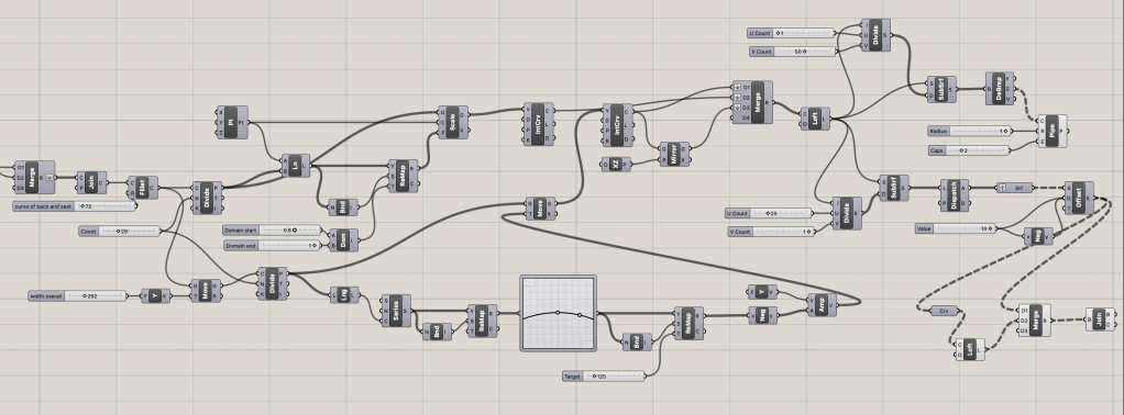 My grasshopper code had a couple changeable parameters, the first group is changing the base of the chair which is a circle. I can tune how much the base goes under the chair, and also how stretched both horizontally and vertically the base can be. The rest of the code is working on connecting the base and the back of the chair. I can change how wide the entire chair is, how much of a curve there is between the seat and the back, how slanted the back it, how much of a lip there is on the top of the chair, how skinny the seat gets before the back, and how wide the bars (and the lines in between the bars) are on the chair/ how many there are.