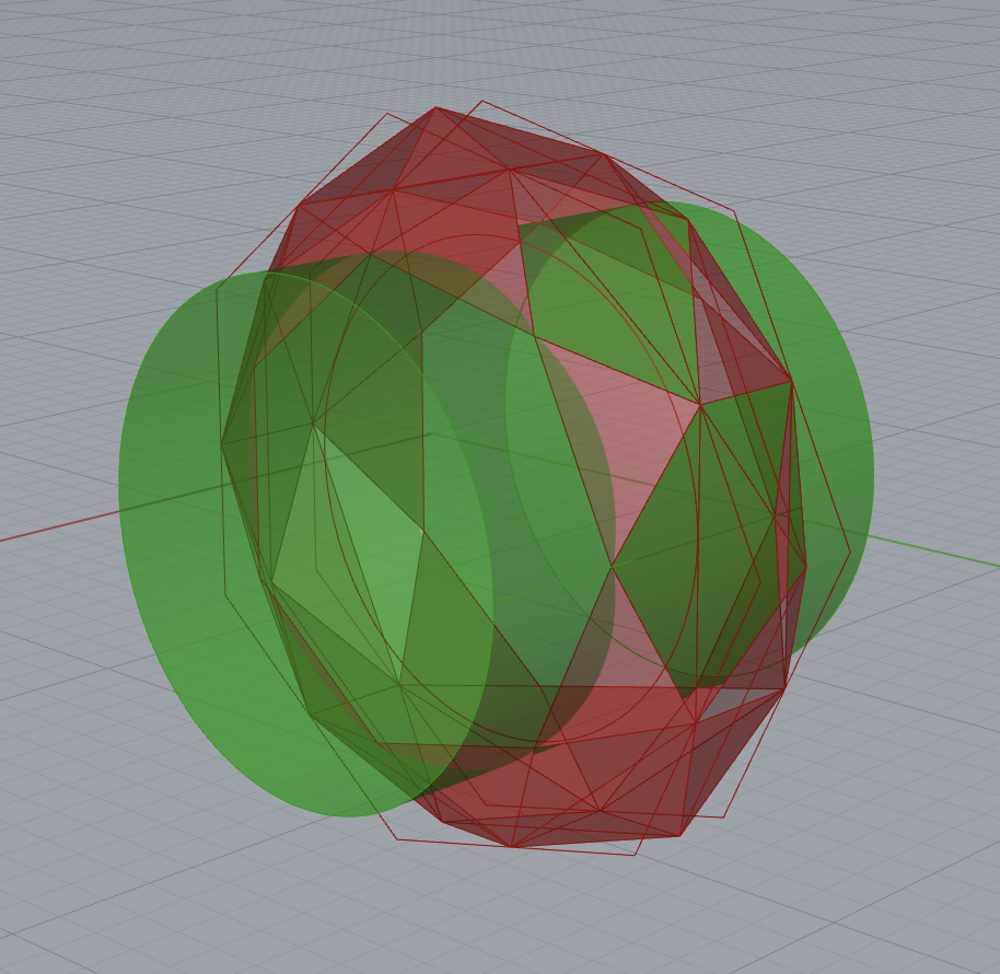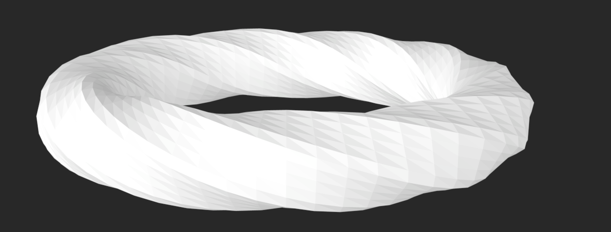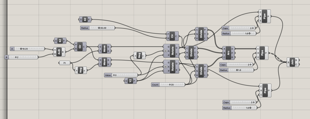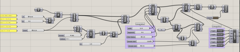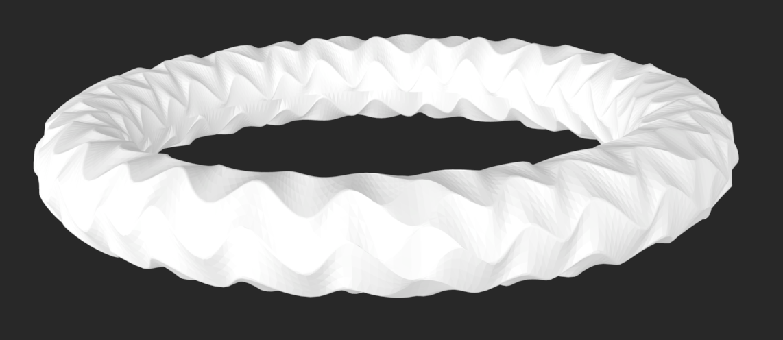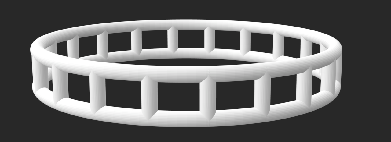 For this last ring, I added two circle slightly smaller than the band size and angled them a bit out so it would create shape between the top and the bottom of the ring, but I also had that be changeable so the ring could be the same width around. I then divided the circle into points and connected them. Based on how big the middle circle was, the connecting lines would be more or less curved. I then used the pipe function to the outside circles and the connecting lines to make it have shape, which could be made larger if a thicker ring was wanted. The number of connecting lines in between was also able to be changed.