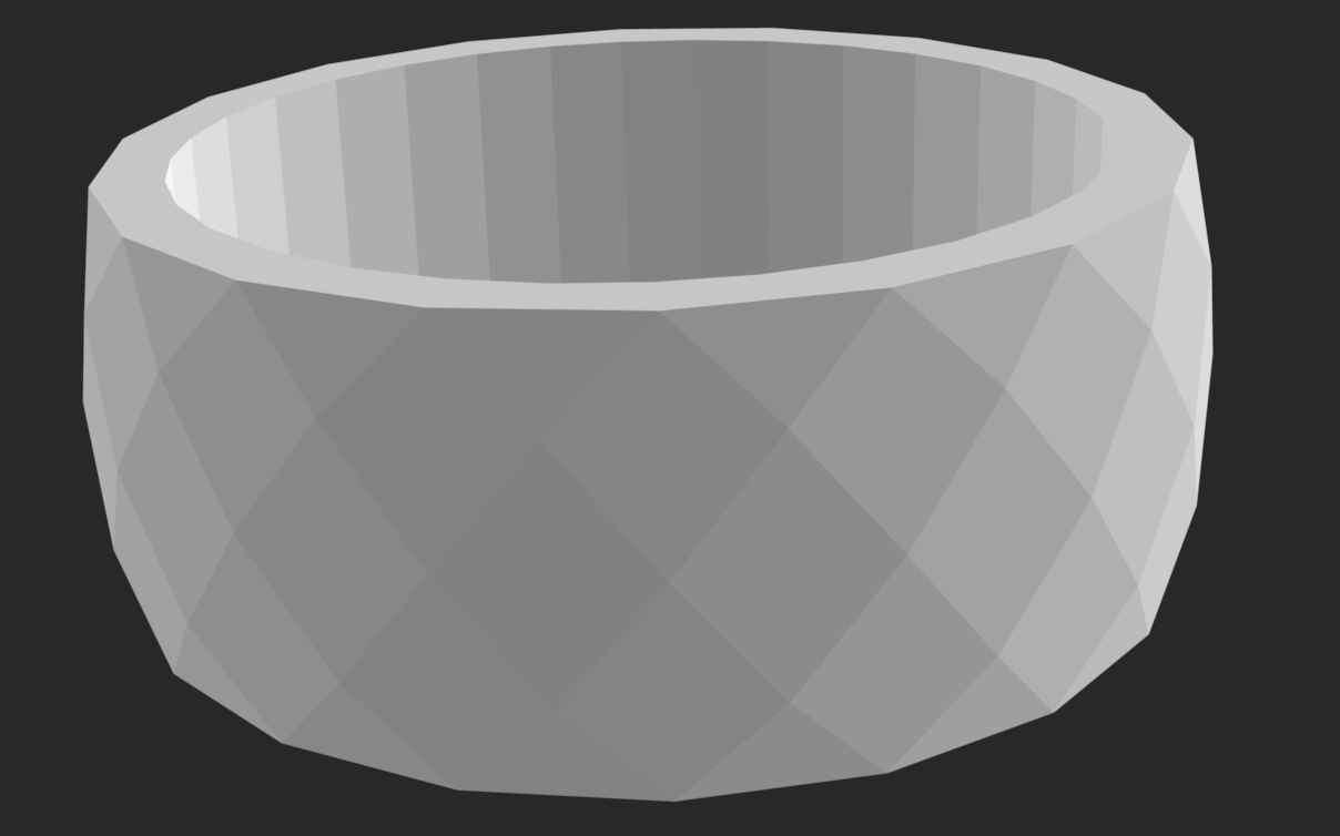 For my first ring, I started by making outside polygons which I split into points, then shifted a couple of the points so I could connect them at angles instead of straight across, which gave the ring more of a geometric look. When I increased the number of points (the number of sides the outside polygons had), it increased the number of shapes in the sides of the ring. I ended up making an inner cylinder that I intersected with the outside polygons to make the inside band.