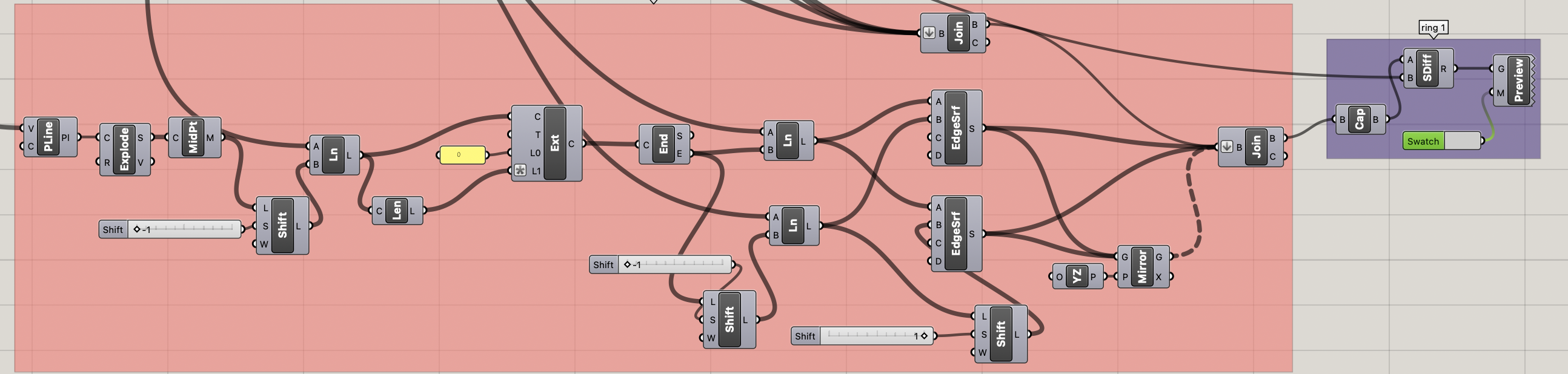 For our final project for the class Computational Foundations we were allowed to explore any topic we wanted that relates to what we learned through the semester. In every assignment we had that was parametric I had a lot of fun, so I decided to do more of it for my final project. I decided to make parametric rings, as I wear a lot of rings and are always looking for new styles, and wanted to come up with a easy way to test designs on myself before I would buy them. I ended up with 3 separate grasshopper codes that made different ring outputs, the first being a geometric ring, the second being a more organic and curvy ring, and the last being 2 bands connected by stripes. For each of these, there were many parameters I could change to give each ring type multiple outputs, but the one they had in common was band sizing for each ring so you can design the ring to your ring size.