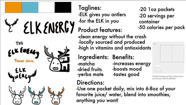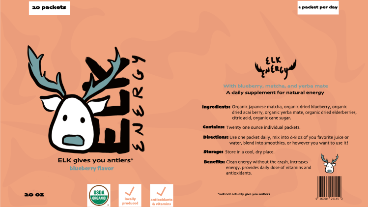 I decided to make a energy/supplement brand, and since my initials are ELK I leaned into that and created a elk logo with bright colors to signify excitement and energy.